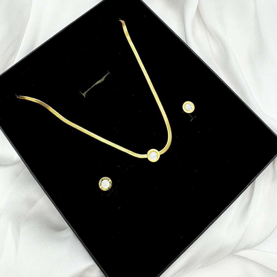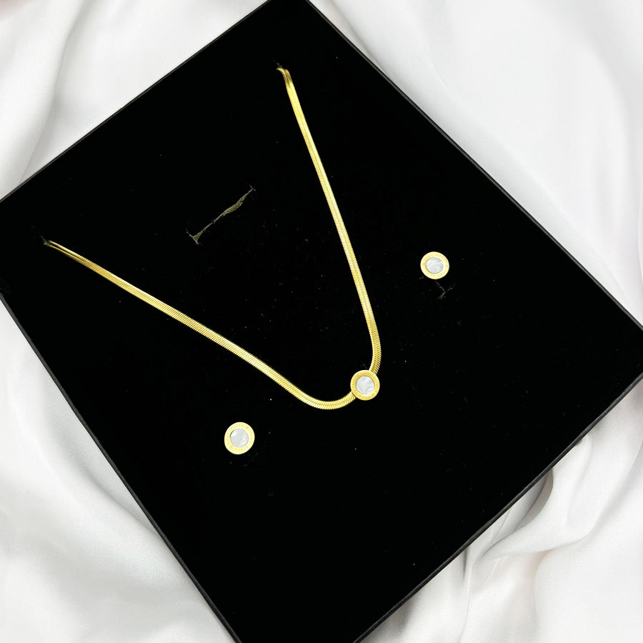 Add a touch of timeless elegance to your accessory collection with this stunning Gold-Tone Round Pendant Necklace and Earrings Set. Featuring a sleek snake chain necklace paired with matching round stud earrings, this set is designed to complement any outfit, whether formal or casual. The elegant gold-tone finish and delicate white accents create a luxurious and refined look that’s perfect for any occasion.
